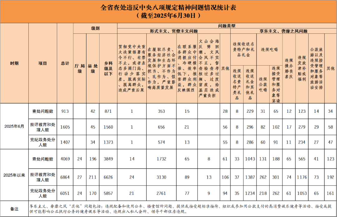 2025年6月全省查處違反中央八項(xiàng)規(guī)定精神問題913起