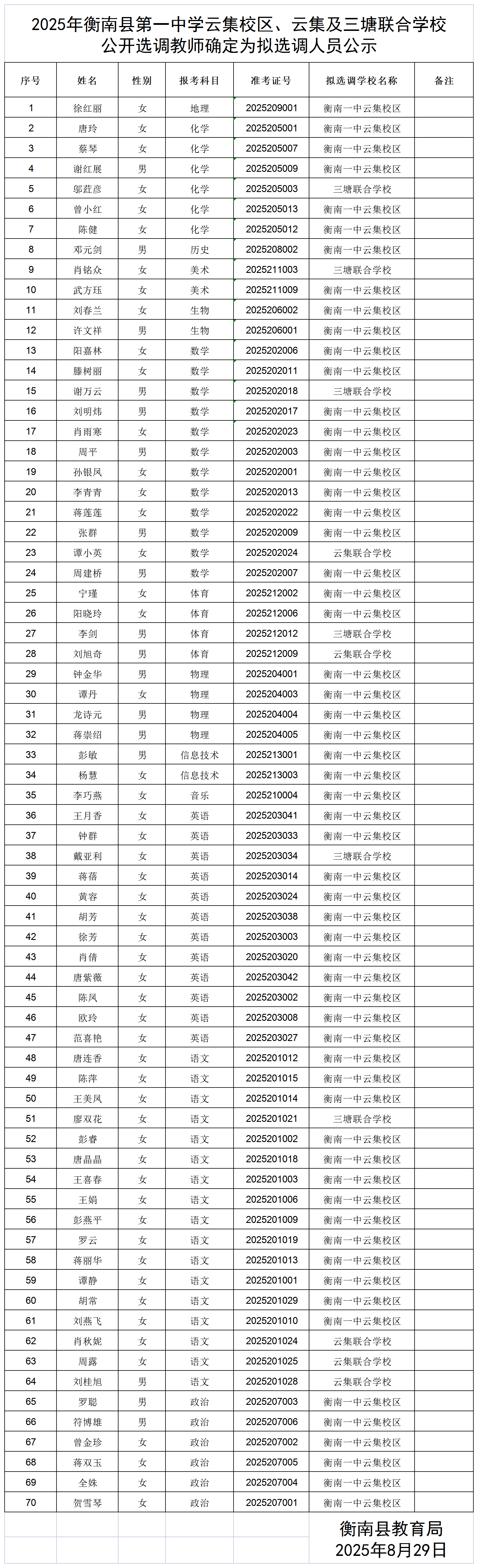 2025年衡南縣第一中學(xué)云集校區(qū)、云集及三塘聯(lián)合學(xué)校 公開選調(diào)教師確定為擬選調(diào)人員公示