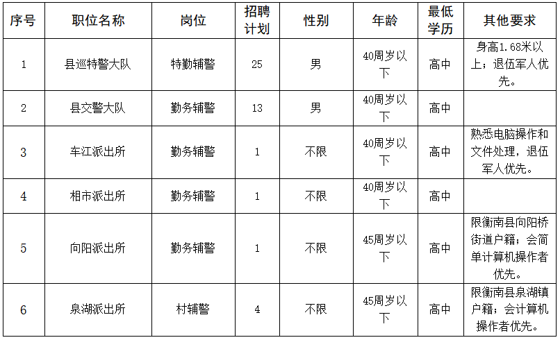 三、車江派出所勤務(wù)輔警、相市派出所勤務(wù)輔警、向陽派出所勤務(wù)輔警、泉湖派出所村輔警等崗位性別要求由“男”變更為“不限”;