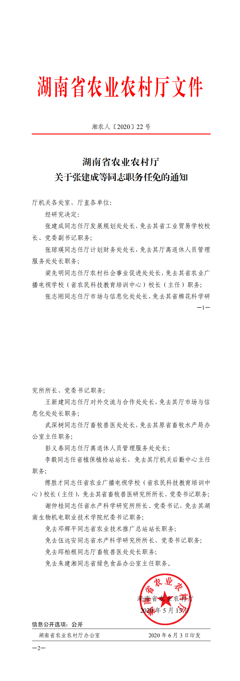 湖南省農業(yè)農村廳關于張建成等同志職務任免的通知
