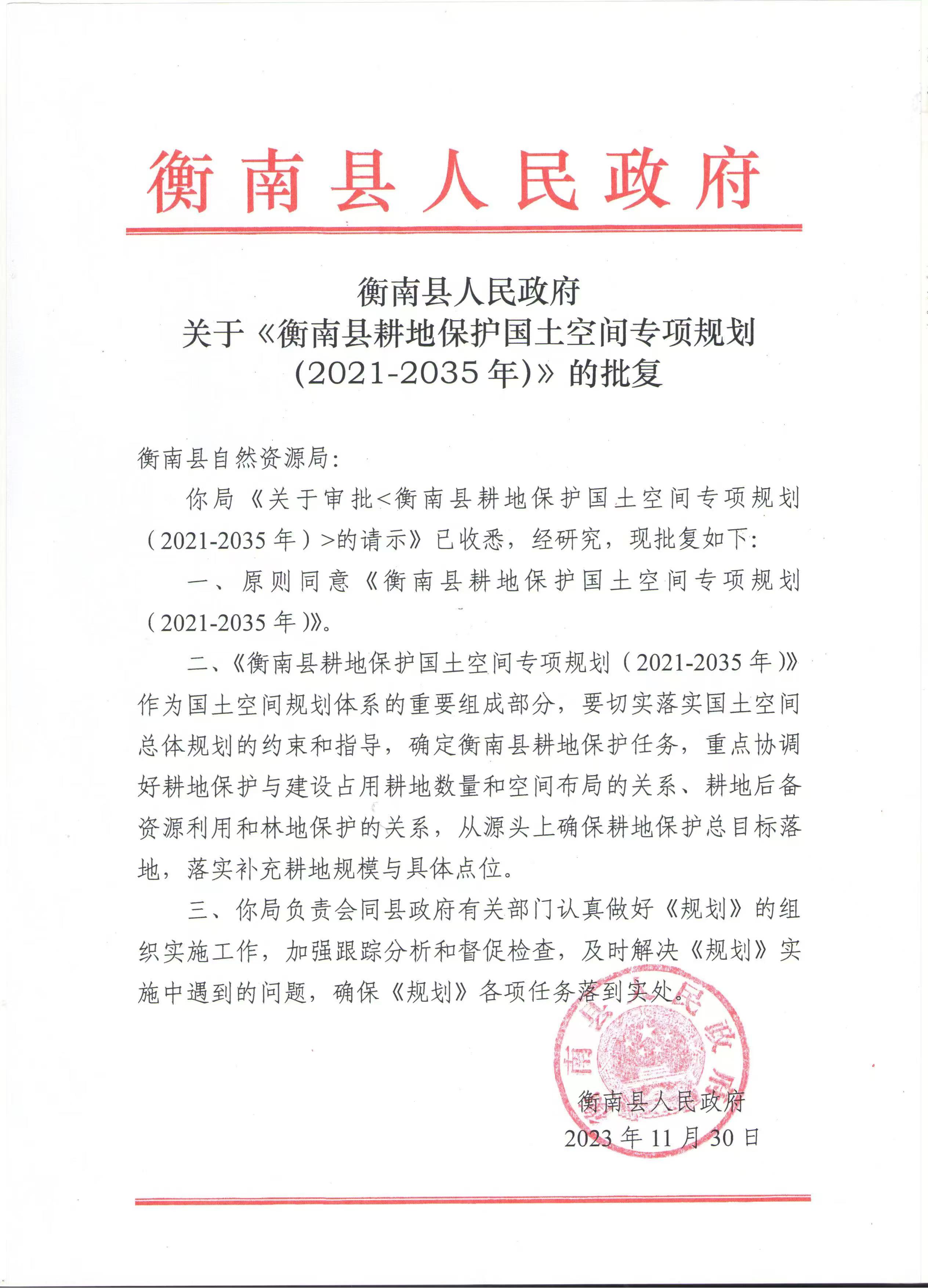 衡南縣人民政府關于衡南縣耕地保護國土空間專項規(guī)劃(2021-2035年)的批復(清政函〔2023〕 號)