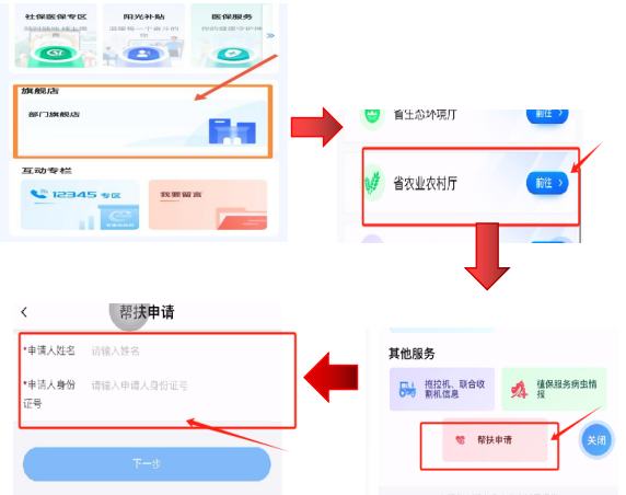 5.湘易辦申報(bào)。一般農(nóng)戶可通過(guò)下載湘易辦APP或者登錄微信搜索湘易辦小程序,點(diǎn)擊旗艦店→部門(mén)旗艦店→省農(nóng)業(yè)農(nóng)村廳→其他服務(wù)→幫扶申請(qǐng),輸入相關(guān)信息進(jìn)行申報(bào)。