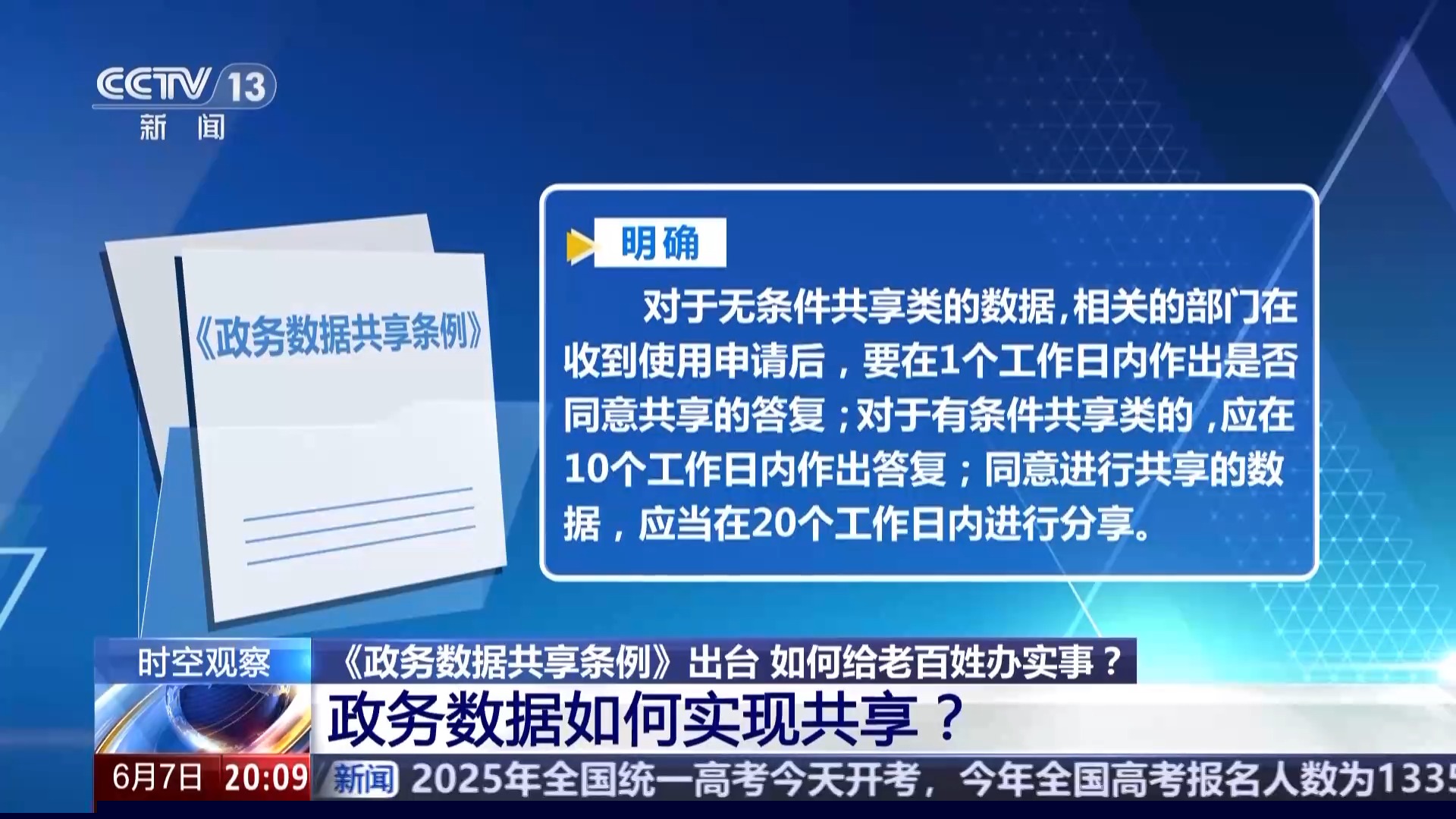 近日,《政務(wù)數(shù)據(jù)共享?xiàng)l例》正式出臺(tái),對(duì)政務(wù)數(shù)據(jù)的目錄管理、共享使用、平臺(tái)支撐等工作進(jìn)行部署。目的是推進(jìn)政務(wù)數(shù)據(jù)安全有序高效共享利用,提升政府?dāng)?shù)字化治理能力和政務(wù)服務(wù)效能,全面建設(shè)數(shù)字政府。政務(wù)數(shù)據(jù)為什么要共享?如何實(shí)現(xiàn)共享?去年以來,國家數(shù)據(jù)局累計(jì)發(fā)布了70個(gè)公共數(shù)據(jù)"跑起來"示范場景,助力產(chǎn)業(yè)發(fā)展、社會(huì)治理、民生改善。政務(wù)數(shù)據(jù)"跑"起來,帶來了哪些變化?全面建設(shè)數(shù)字政府如何給老百姓辦實(shí)事?