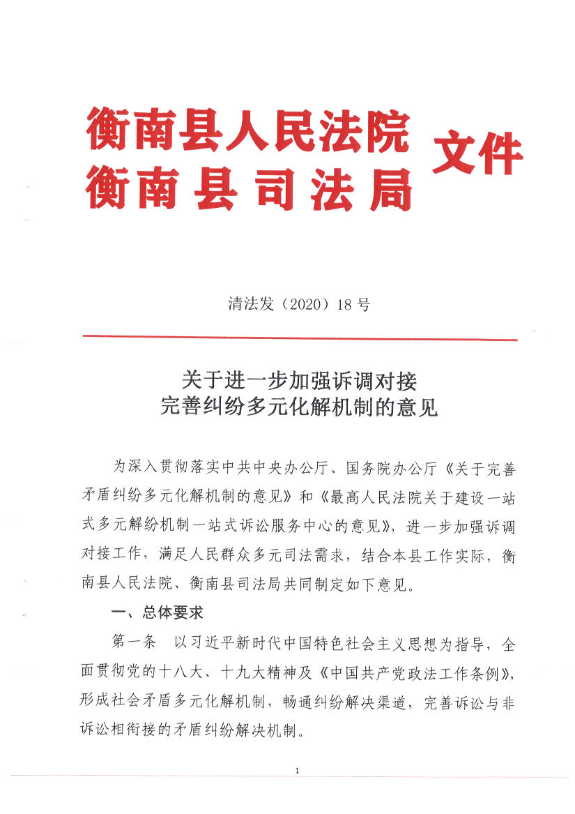 衡南縣人民法院衡南縣司法局關于進一步加強訴調對接完善糾紛多元化解機制的意見(清法發(fā)﹝2020﹞18號)