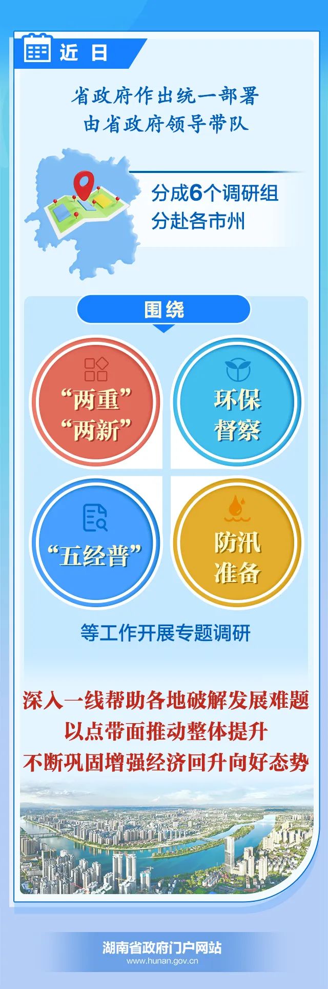 近日,省政府作出統(tǒng)一部署,由省政府領(lǐng)導(dǎo)帶隊,分成6個調(diào)研組分赴各市州,圍繞"兩重"(發(fā)行超長期特別國債支持國家重大戰(zhàn)略實施和重點領(lǐng)域安全能力建設(shè))、"兩新"(大規(guī)模設(shè)備更新和消費品以舊換新)、環(huán)保督察、"五經(jīng)普"(第五次全國經(jīng)濟普查)和防汛準(zhǔn)備等工作開展專題調(diào)研,深入一線幫助各地破解發(fā)展難題,以點帶面推動整體提升,不斷鞏固增強經(jīng)濟回升向好態(tài)勢。